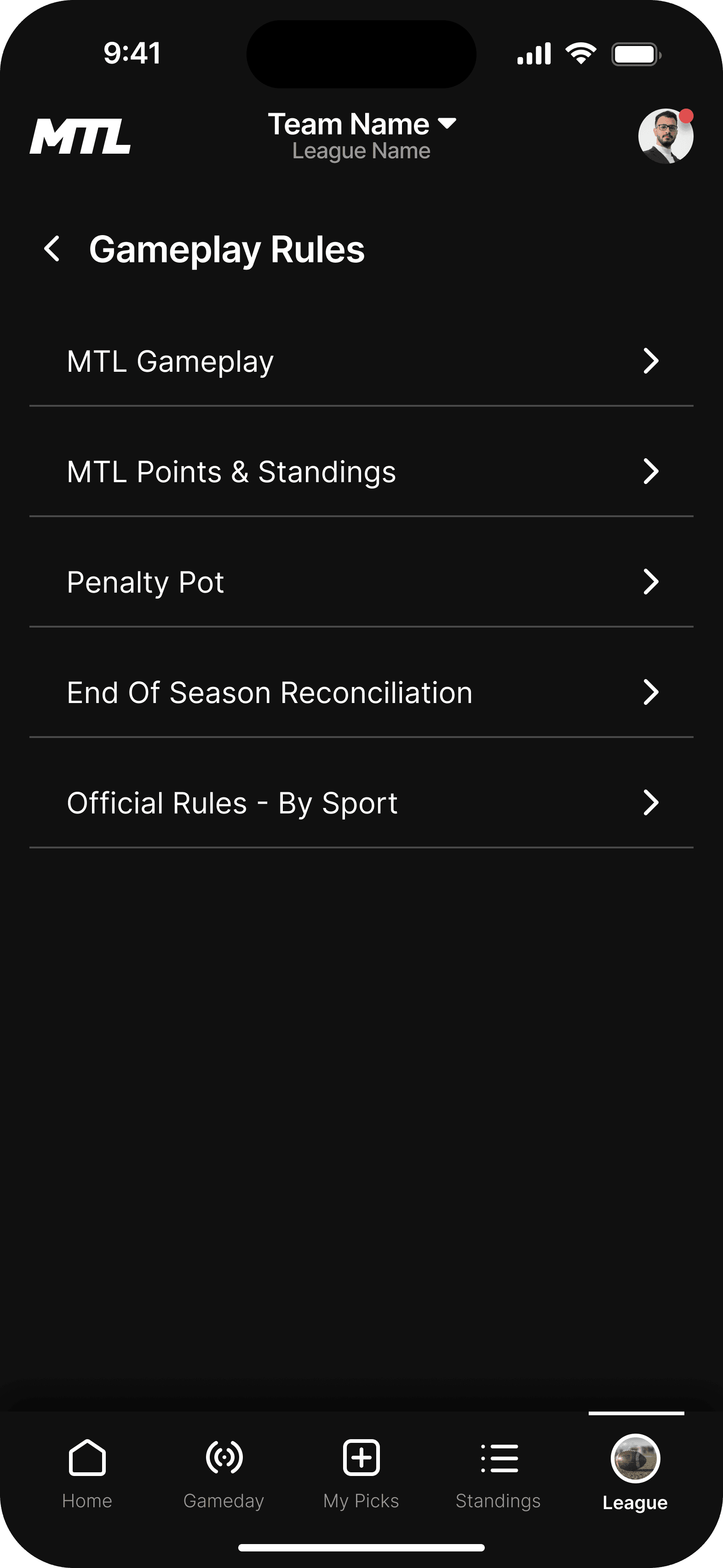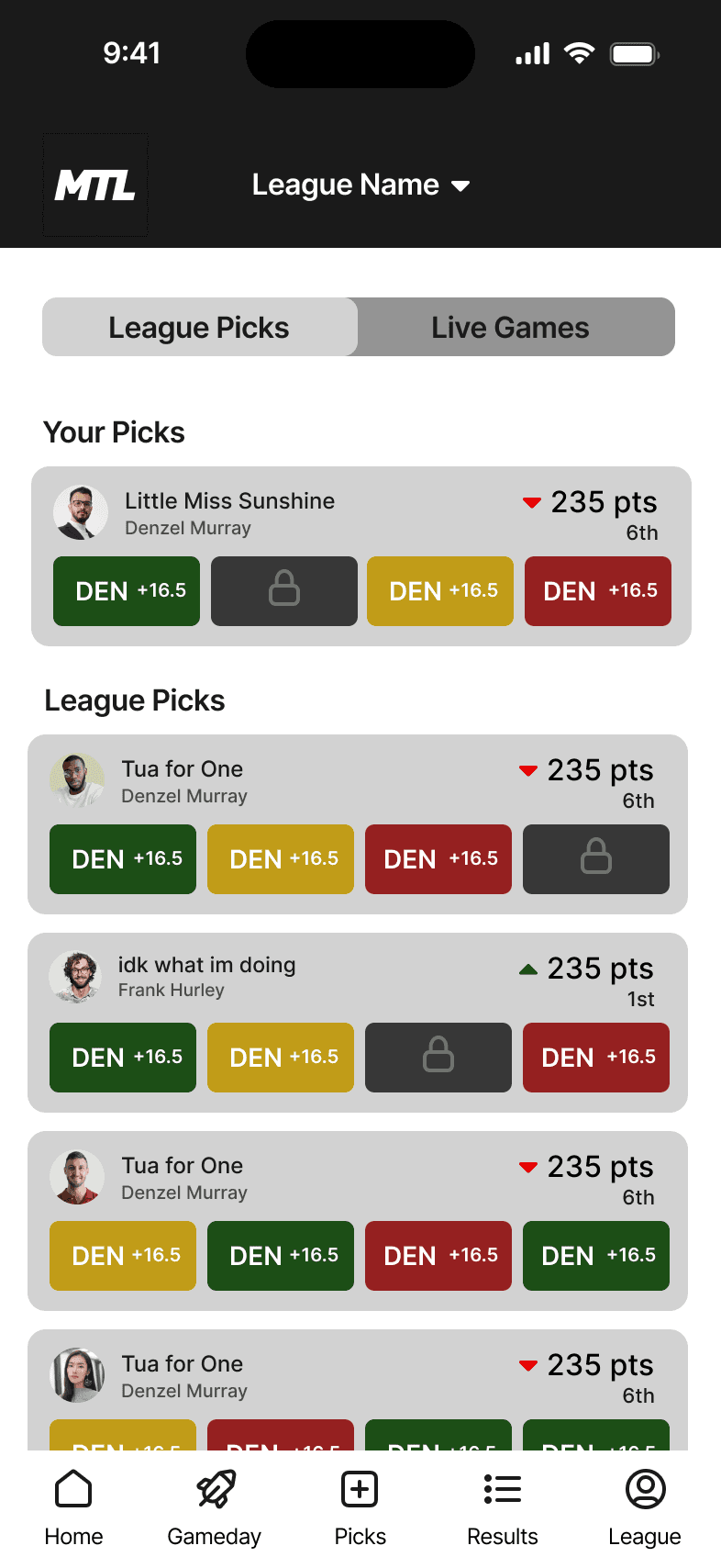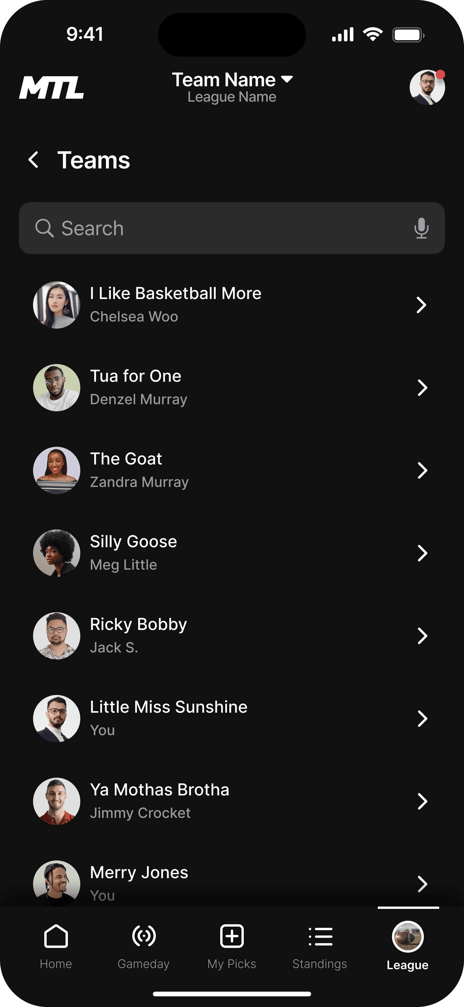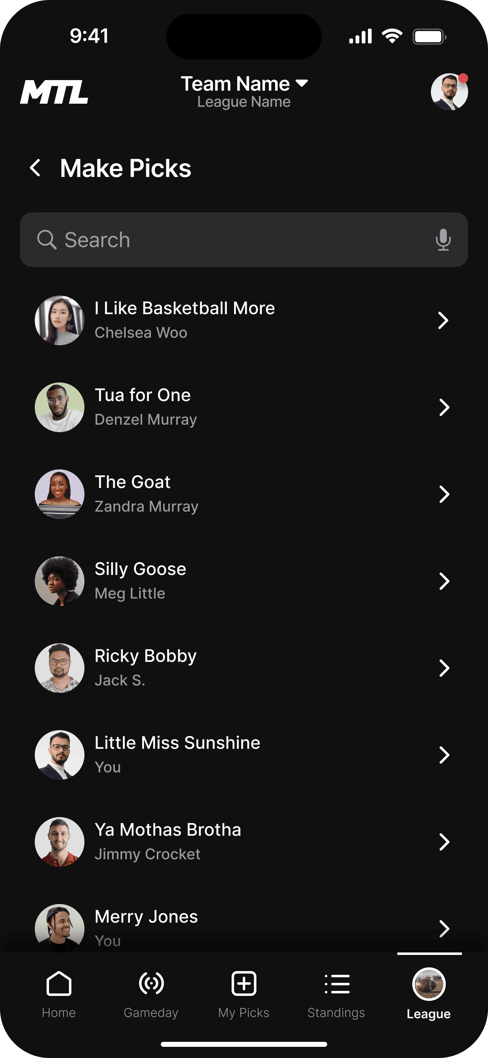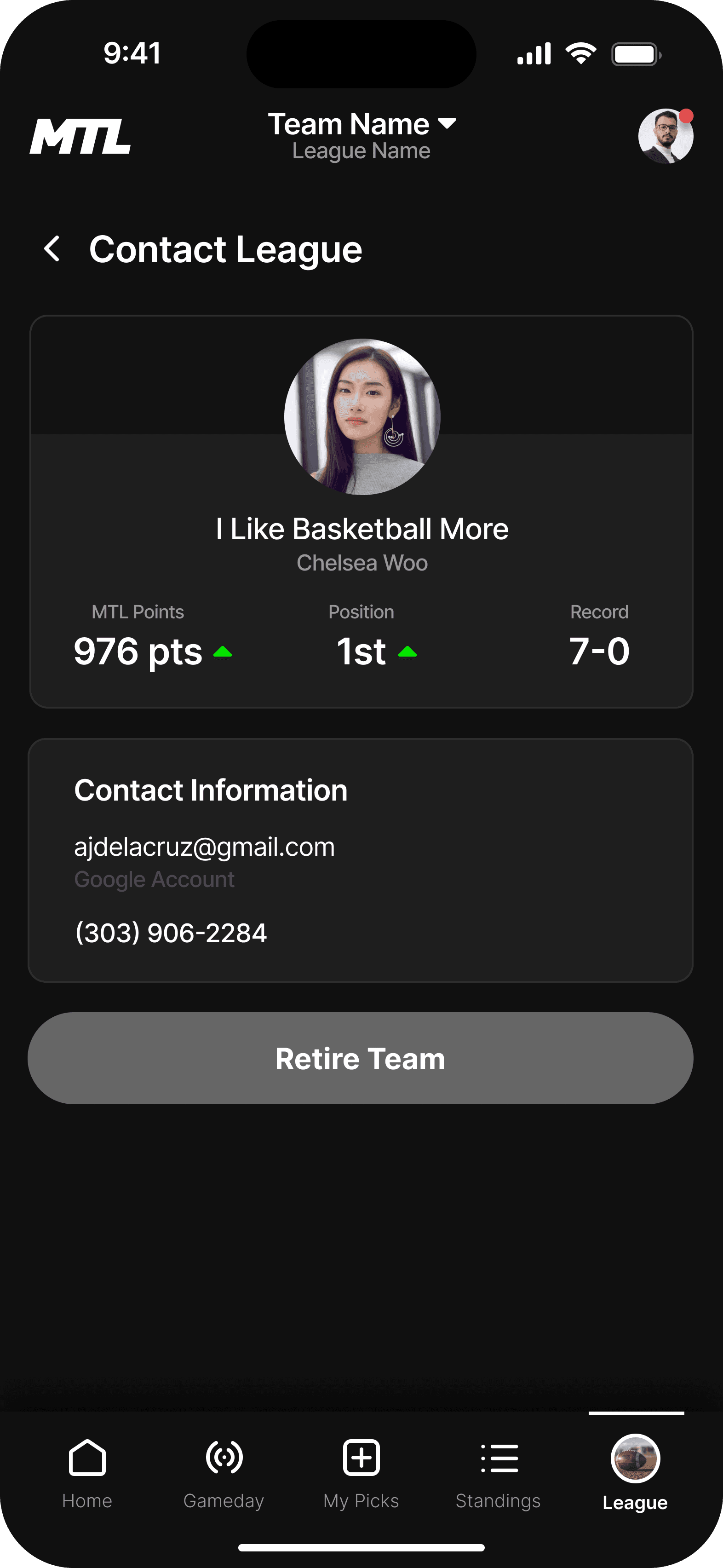 This is the landing page for your league. We wanted the dashboard to incorporate the three main functions users taking while using the MTL app.