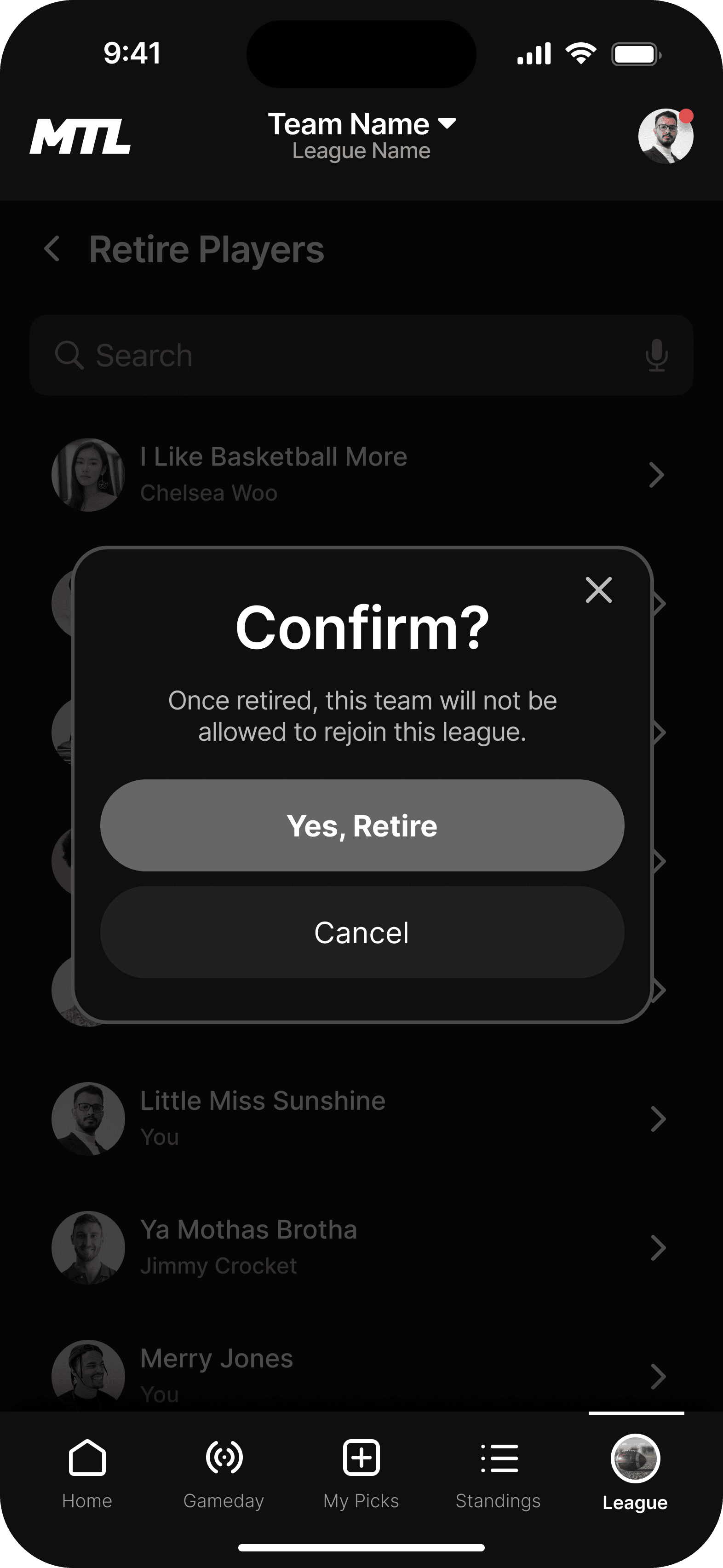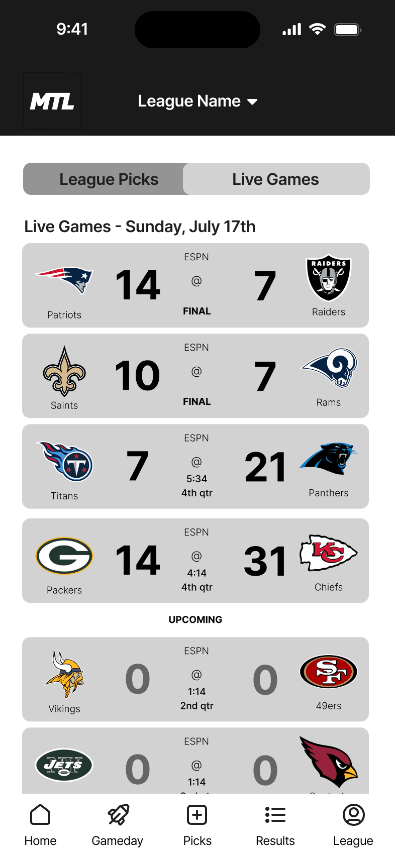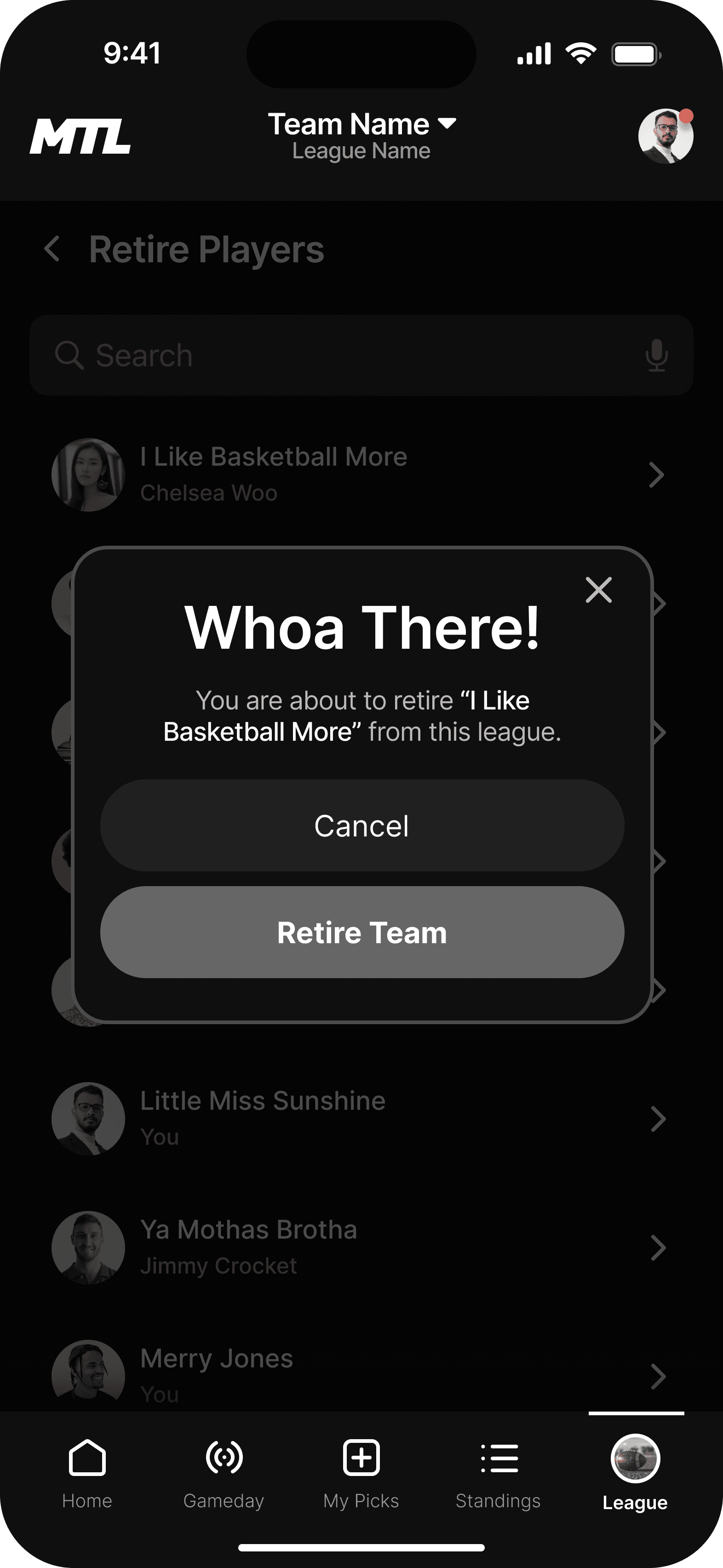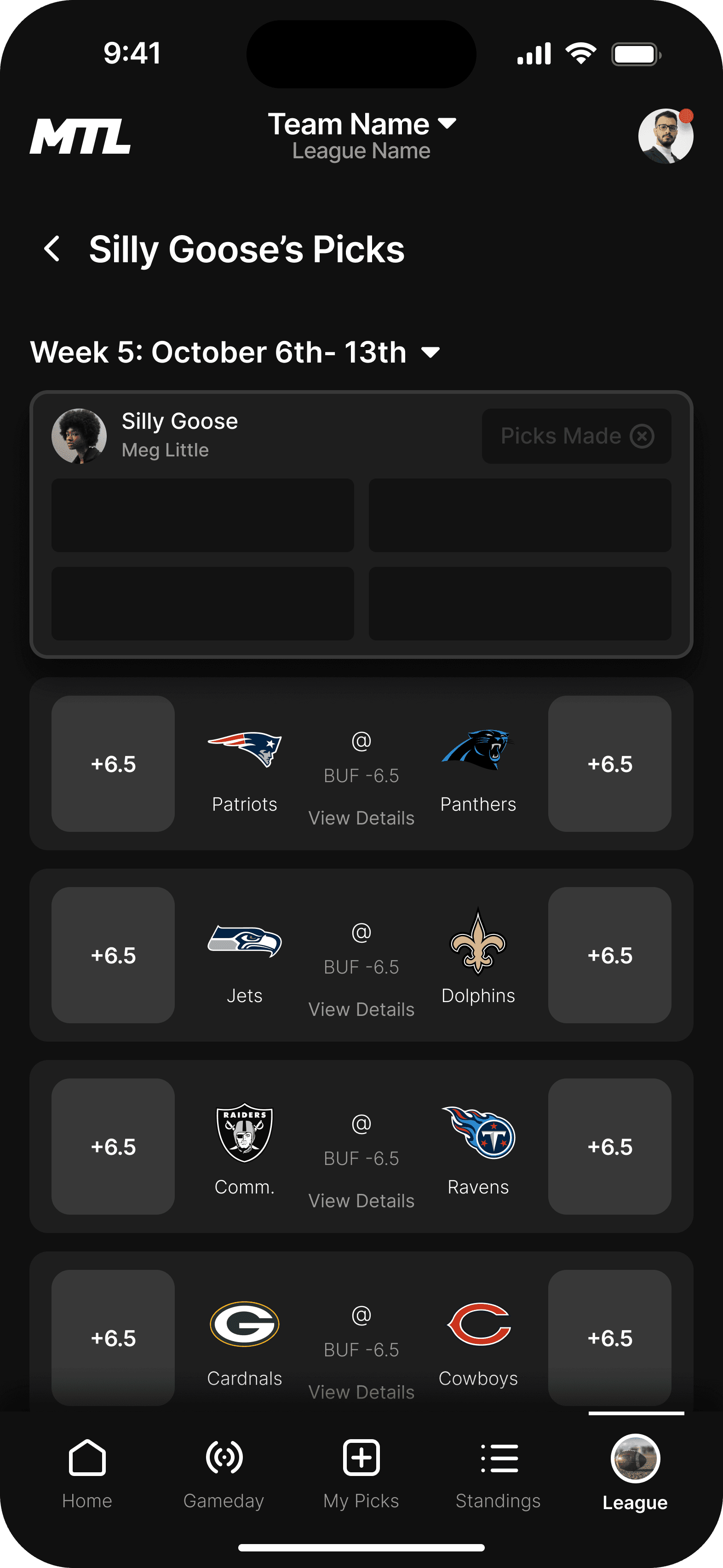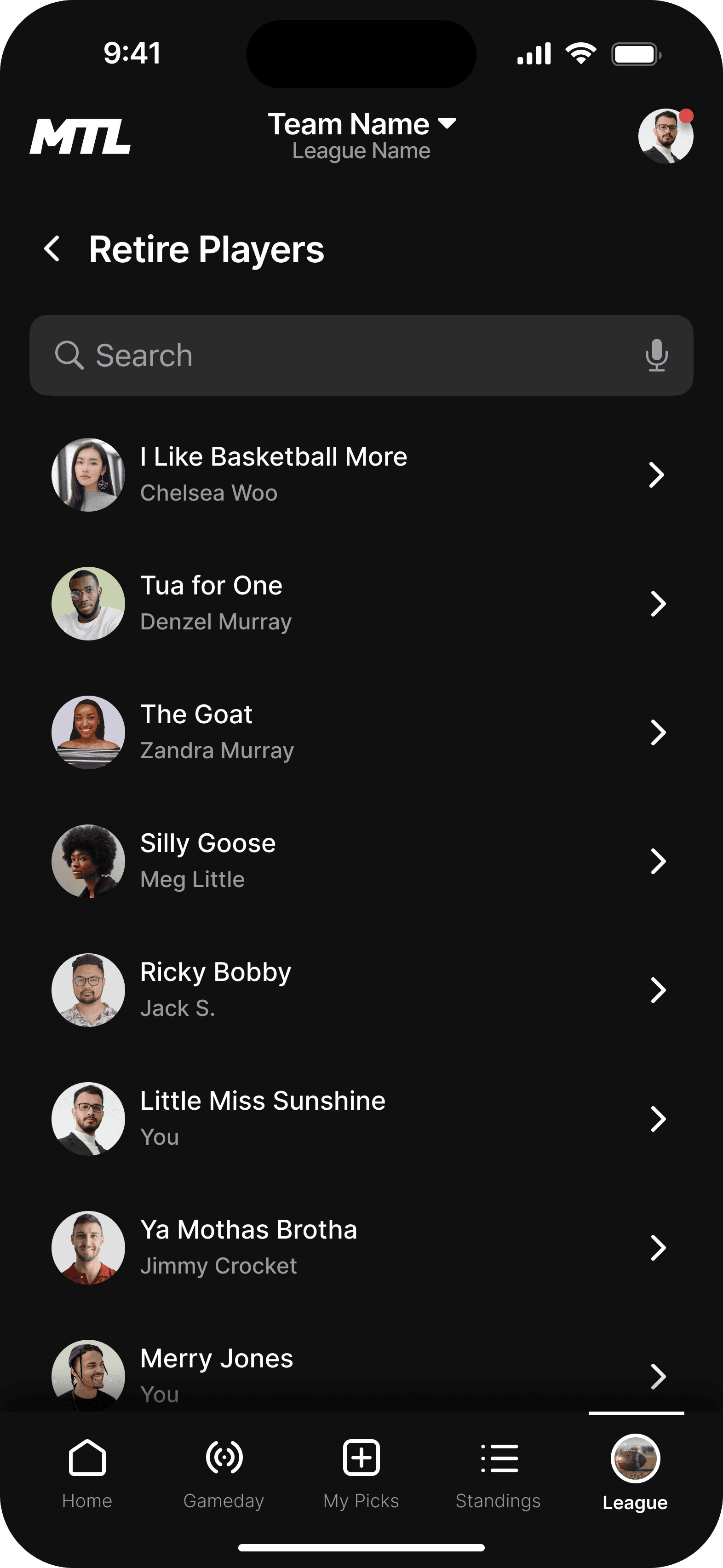 This is the landing page for your league. We wanted the dashboard to incorporate the three main functions users taking while using the MTL app.