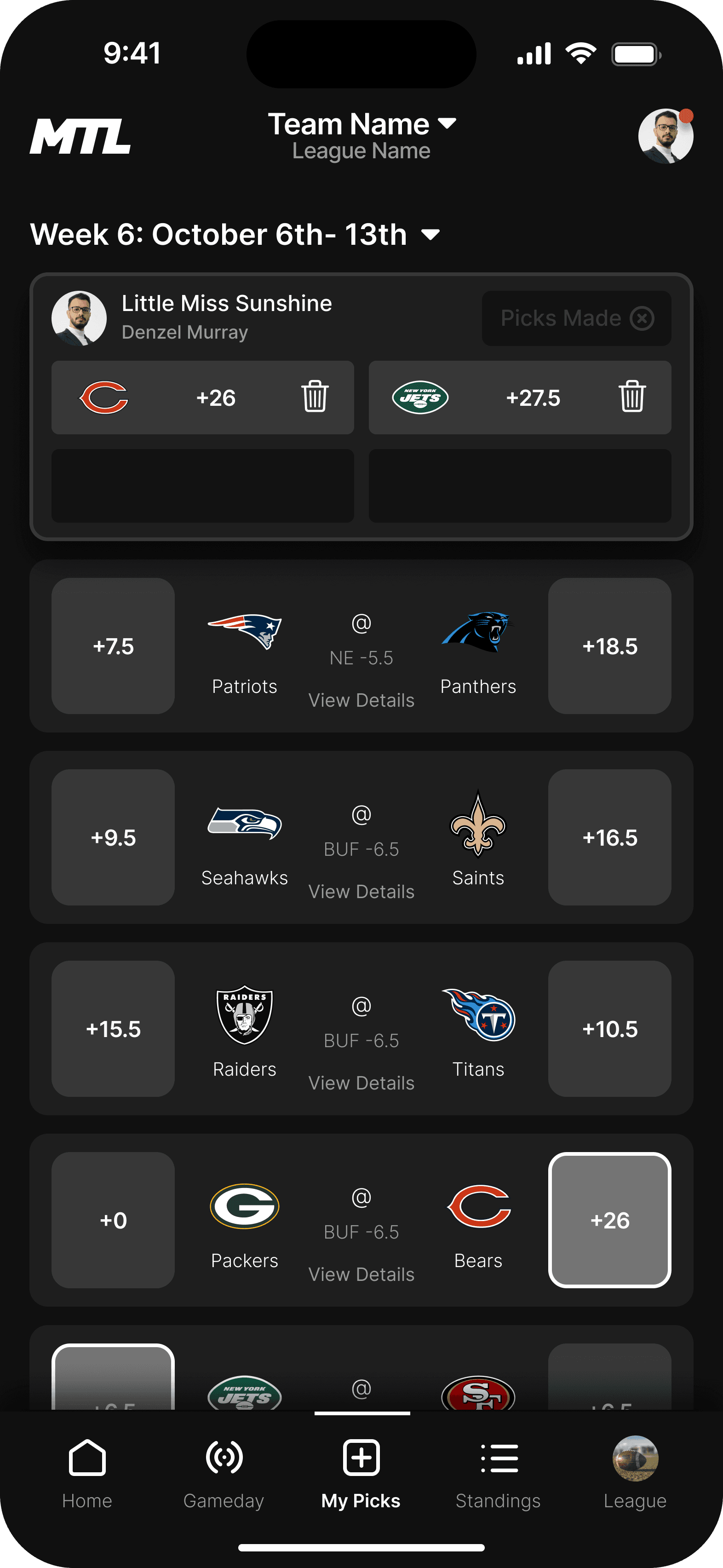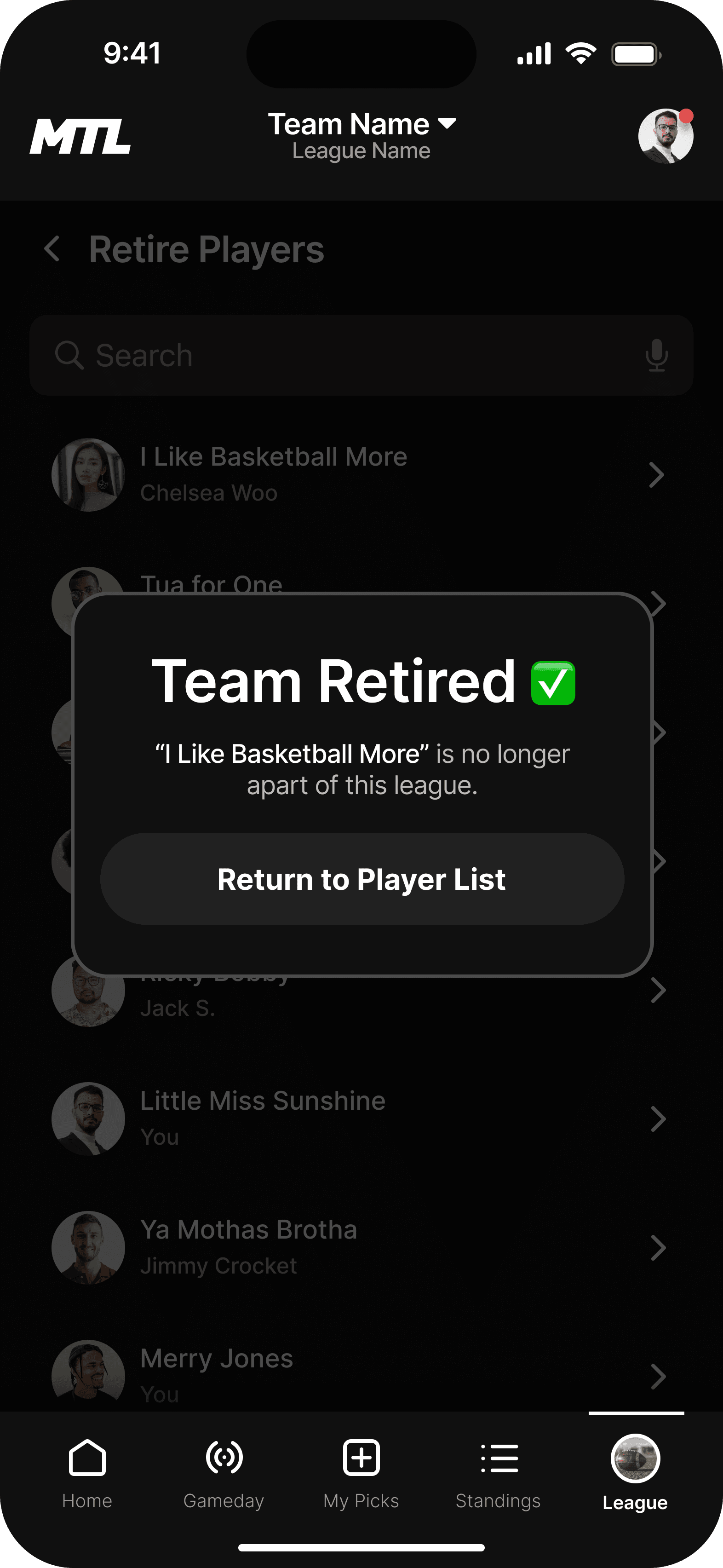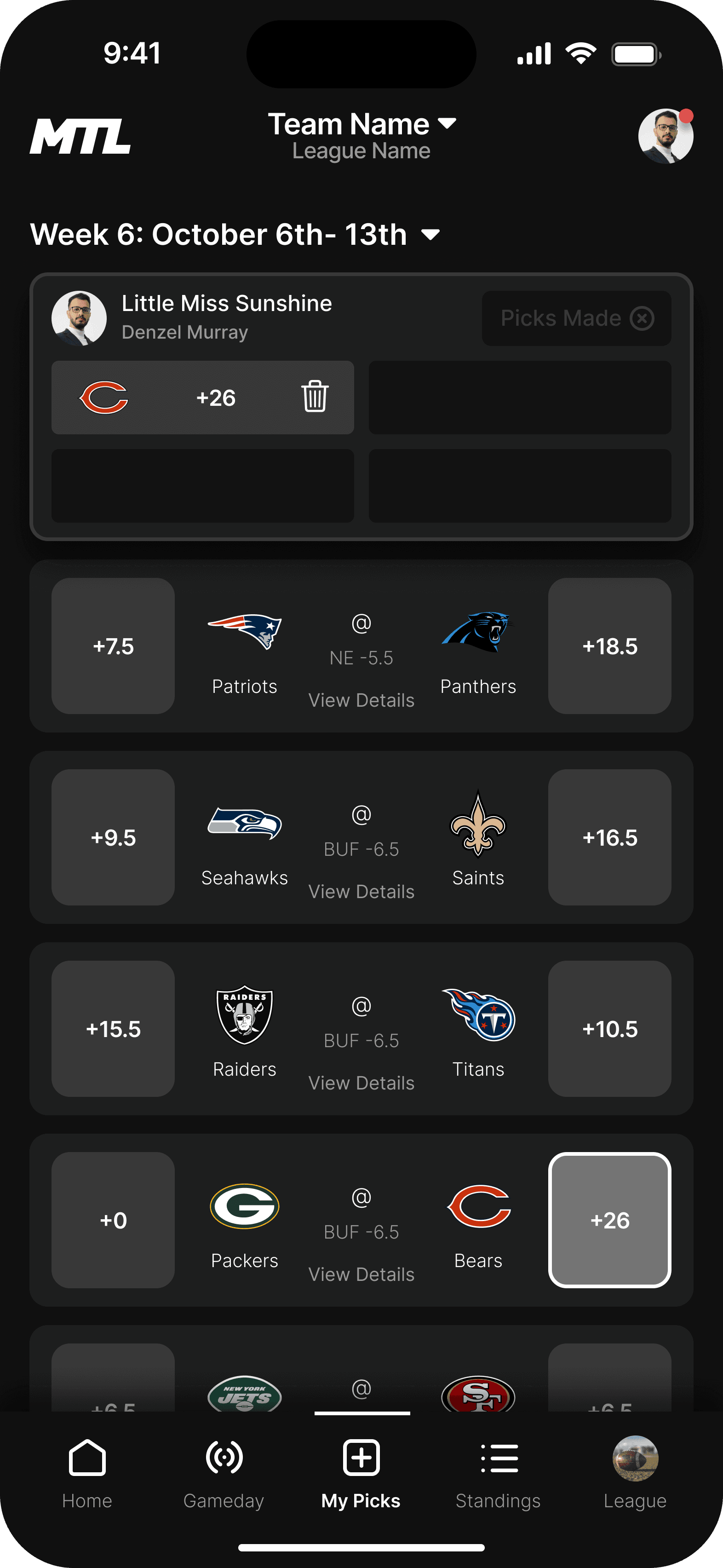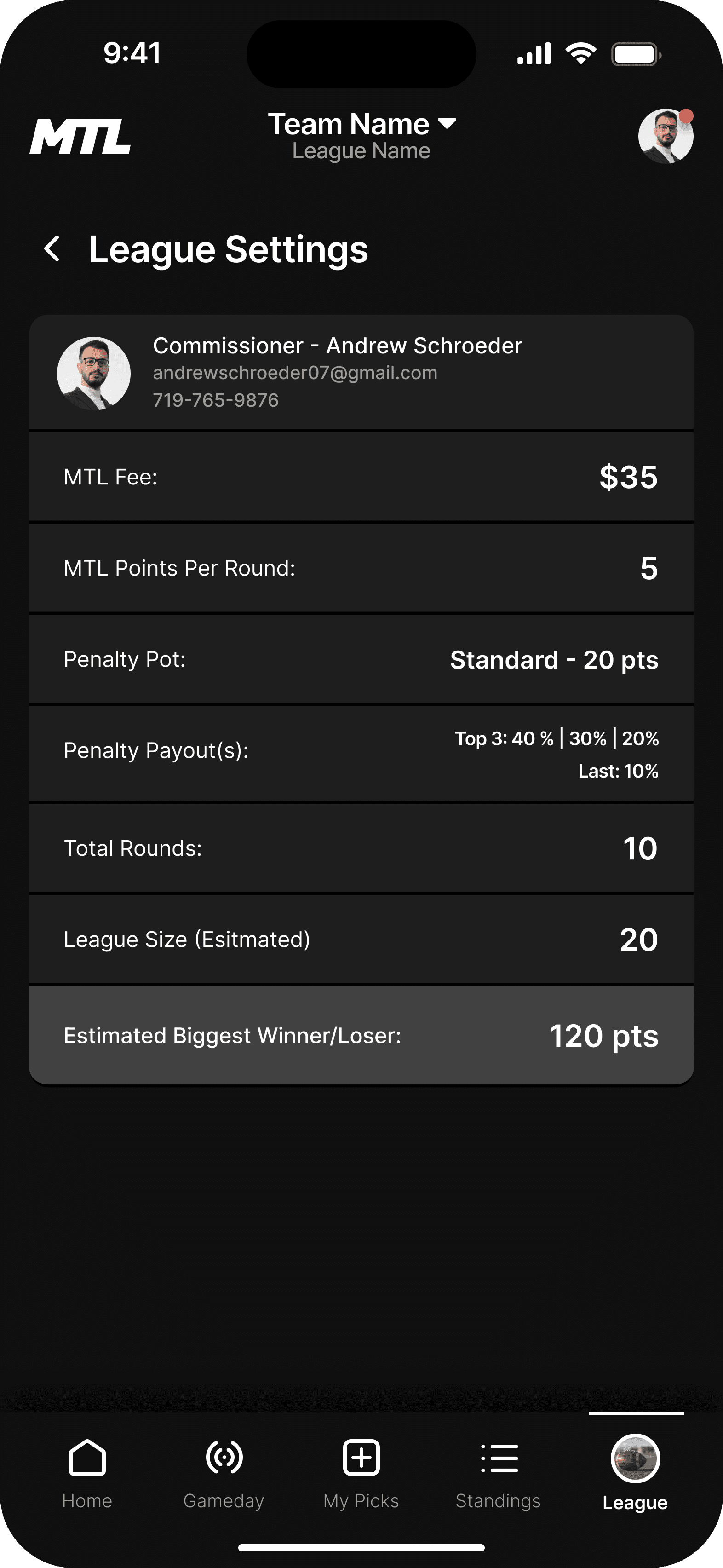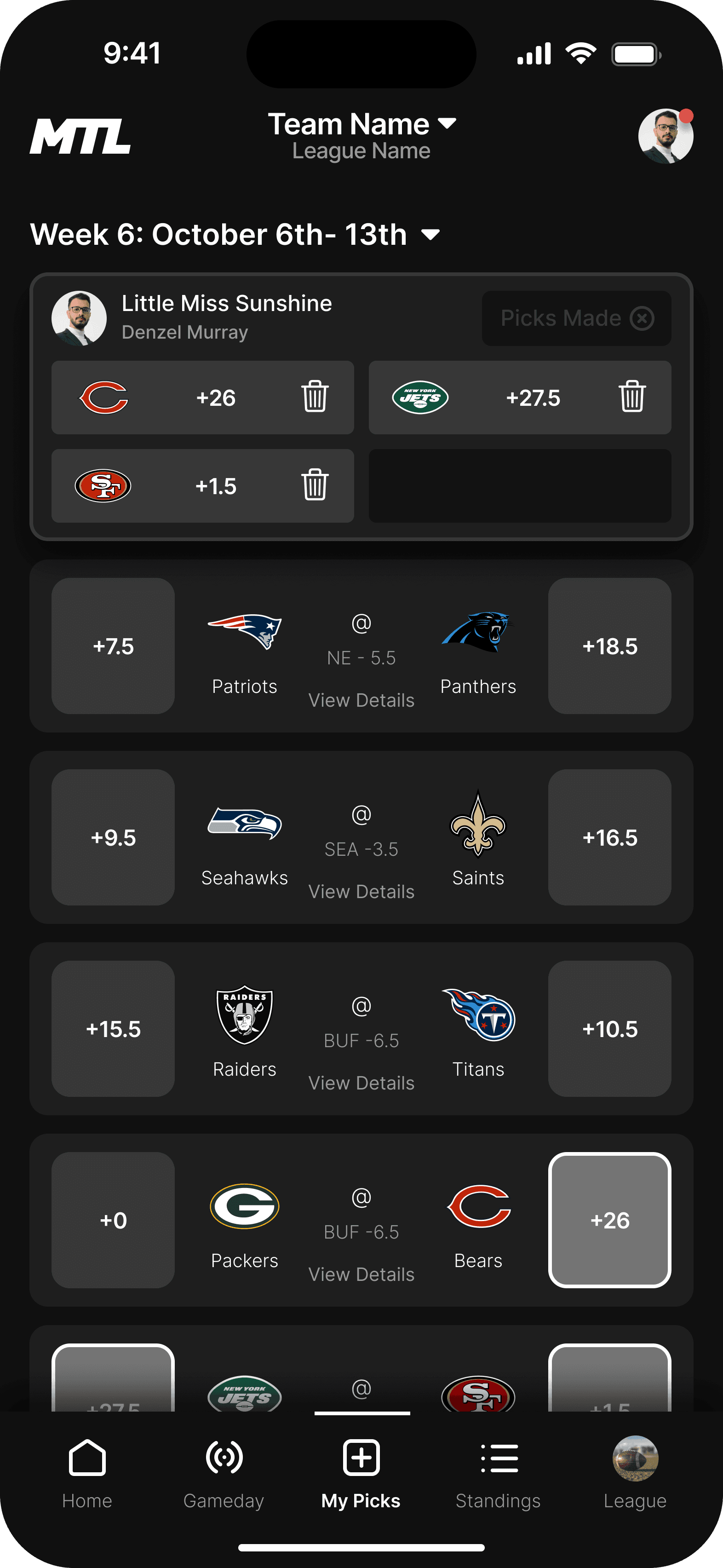 This is the landing page for your league. We wanted the dashboard to incorporate the three main functions users taking while using the MTL app.