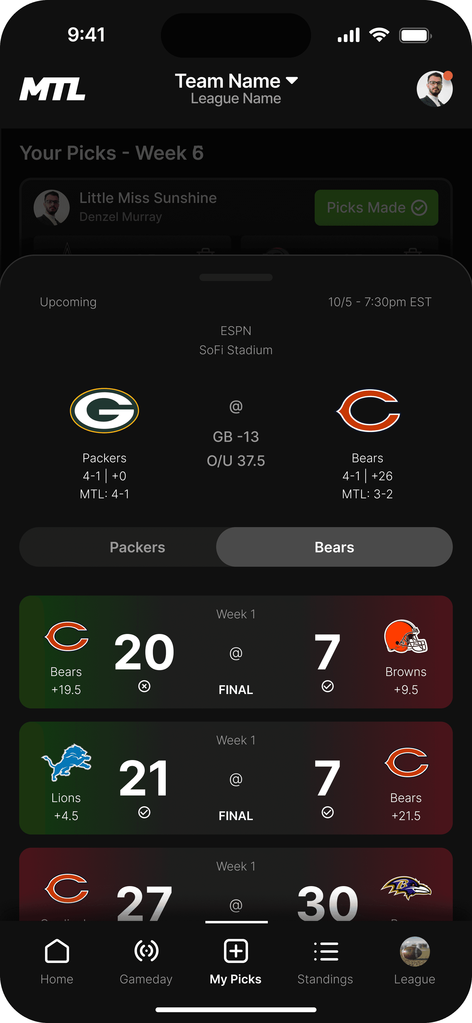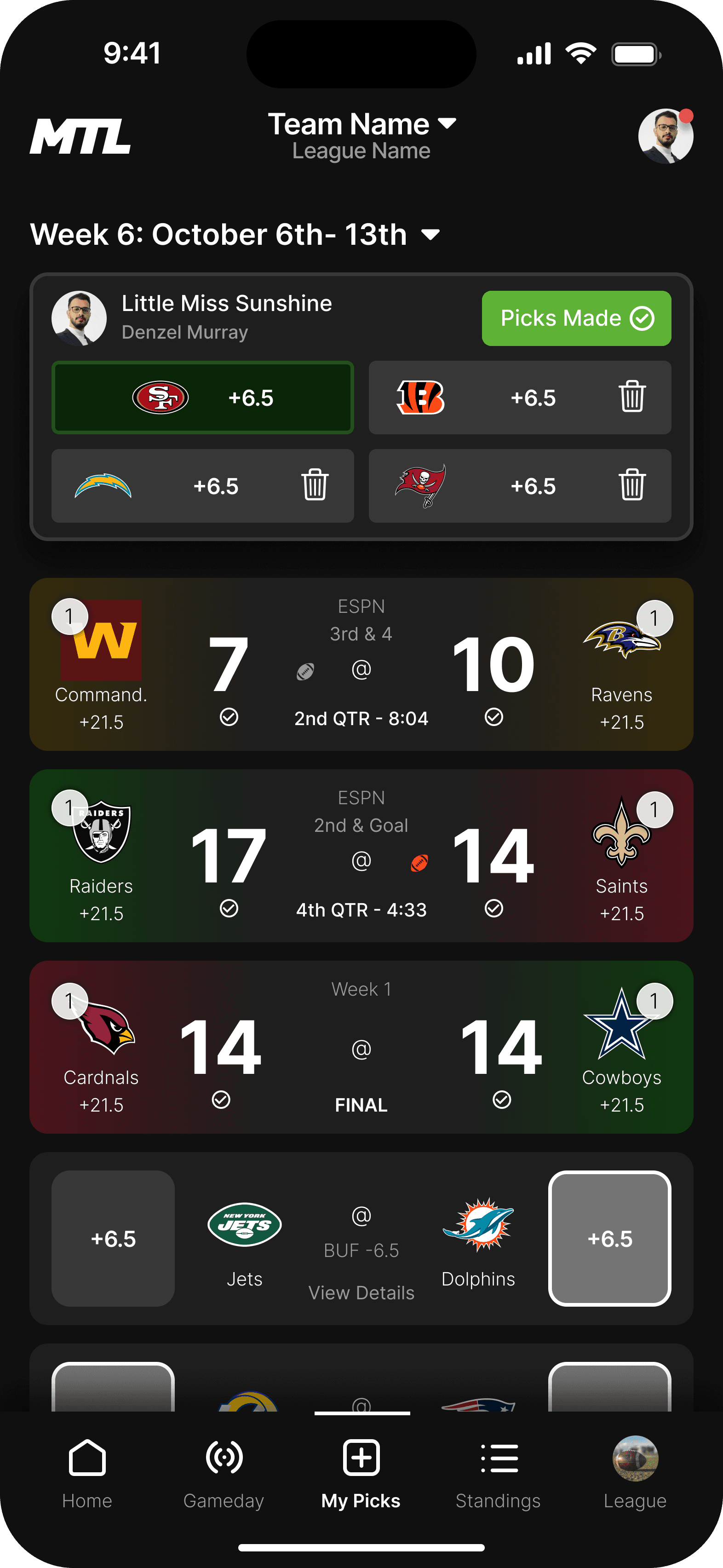 The Gameday feature is a place for users to see how not only their picks are doing, but also how other players in the league are doing as well. Green is covering, yellow is close, and red is not covering. The more red you see with your friends, the better - root for red!