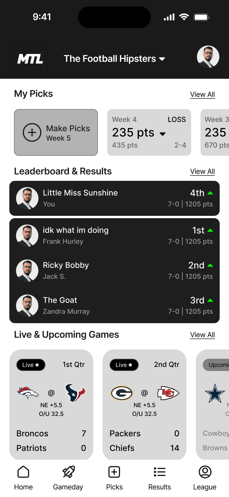Weekly results are front and center. See how you and your friends did this past week, while also noting who the top 3 players in the league currently are.